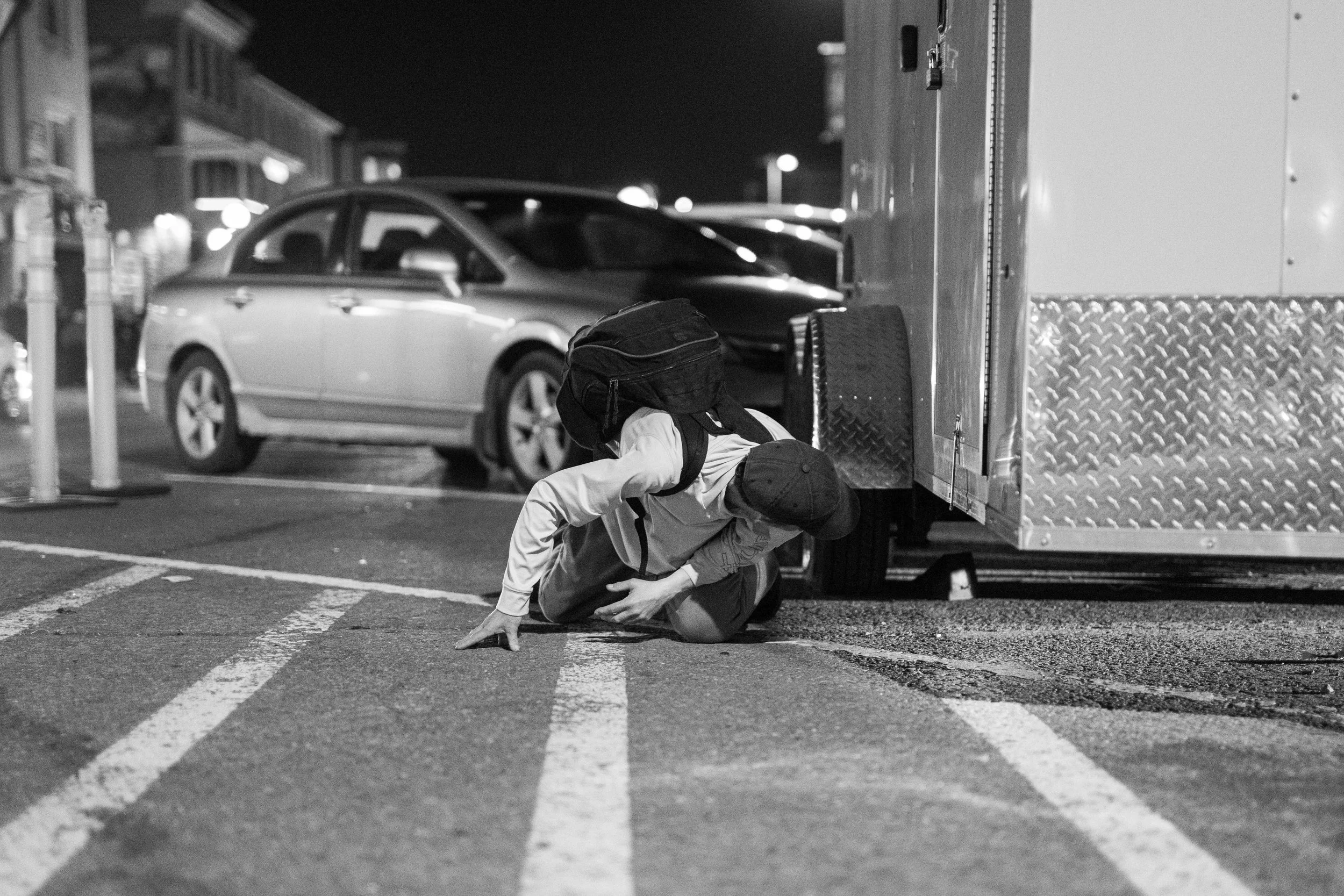 Thumper kneels on the ground as she looks for dropped spare chance underneath a parked trailer in the ByWard Market