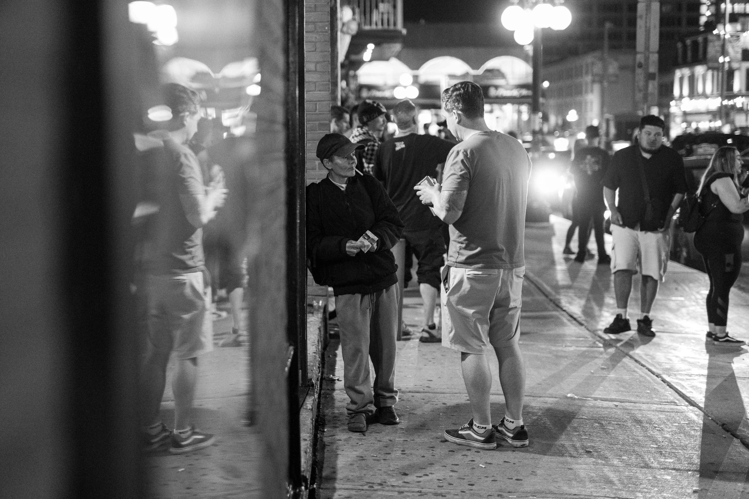 Thumper, left, holds a 20 dollar bill as she panhandles from a patron of a nightlife bar in the ByWard Market