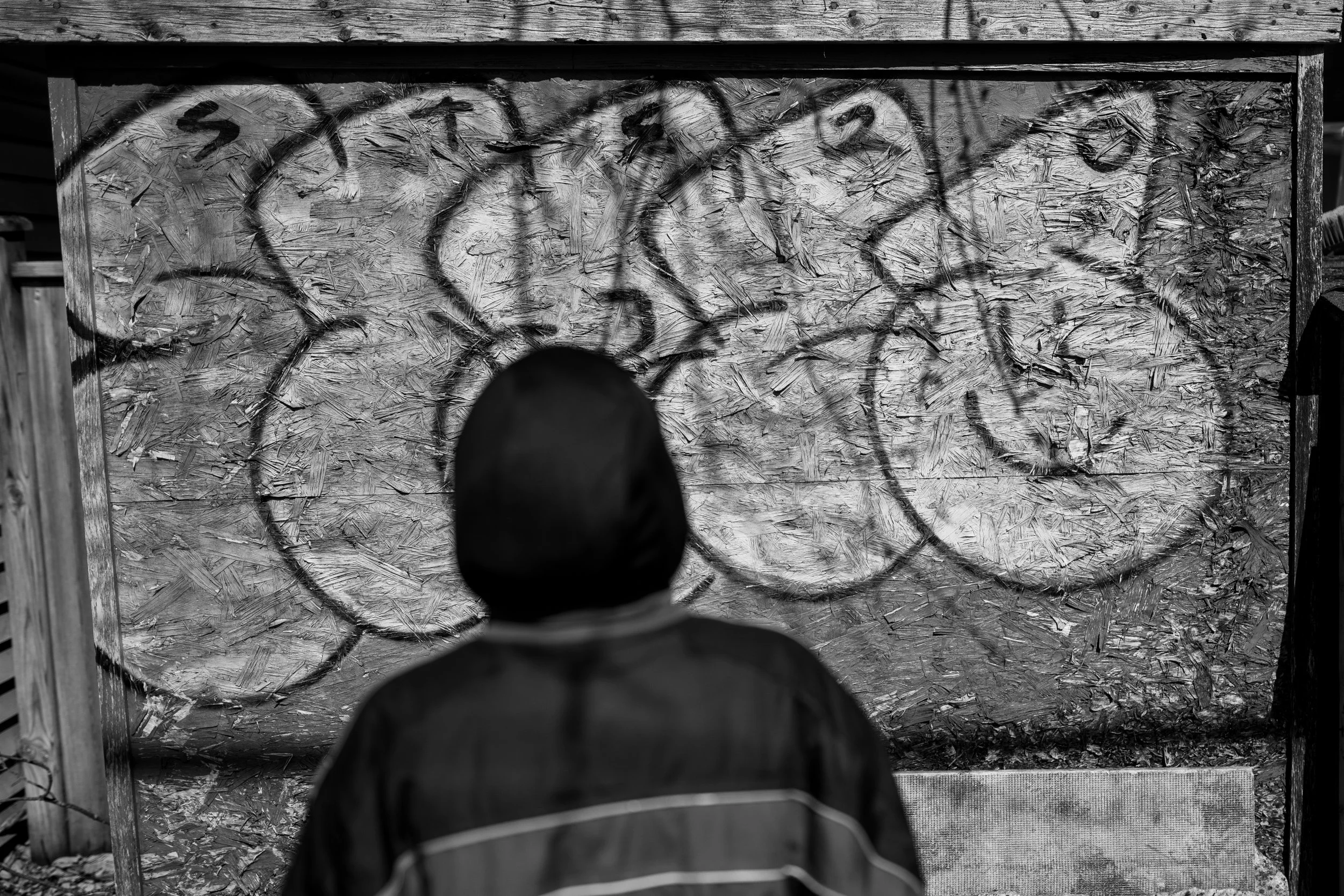Thumper looks towards her cousin Nicky ‘Nikko’ Halley’s graffiti tag in the back of an alleyway in Ottawa’s west-end. Nicky - Thumper’s closet friend in the city - died of a fentanyl overdose in October 2021 and his graffiti art is the only physical memory Thumper has left of Nicky.