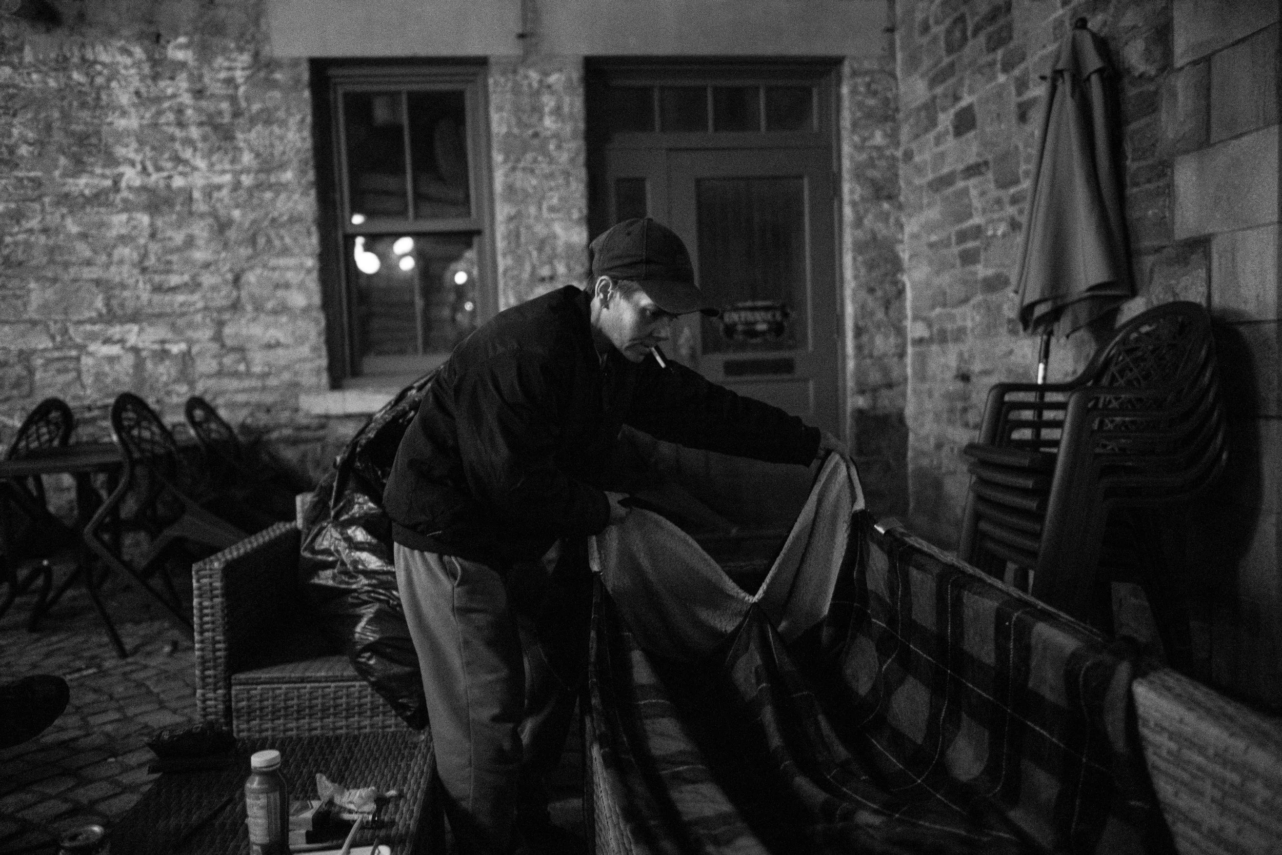 Thumper lays a blanket on top of a couch as she prepares to sleep in the courtyard of the ByWard Market