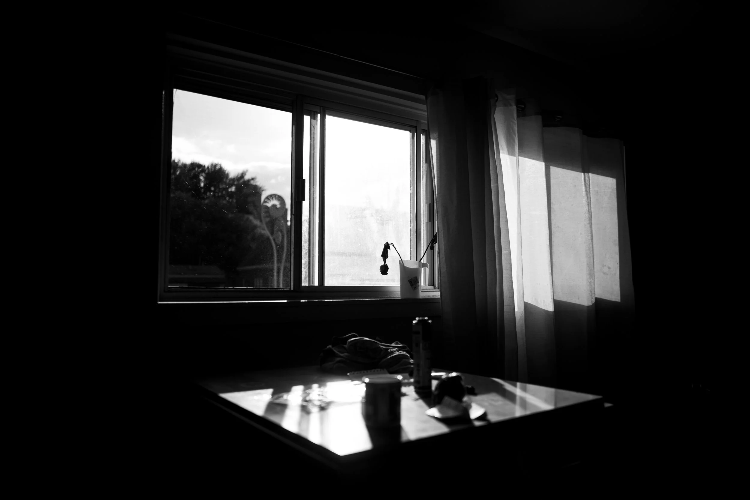 A wilting flower given to Thumper by Tate rests along a window sill in Tate’s apartment building